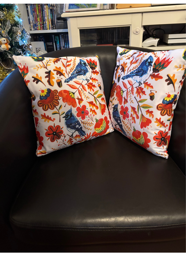 Bring the beauty of nature into your home with our Blue Jay Autumn Illustration cushion, measuring 14 inches by 14 inches. This stunning pillow features a graphic design of a majestic blue jay set against a background of vibrant fall foliage. Perfect for adding a touch of autumnal charm to your home decor, our cushion is made from high-quality materials for durability and comfort. Use it to accessorize your sofa, bed, or chairs, and enjoy the cozy warmth and inviting style it brings to any room. This bird-inspired pillow is a must-have for any nature lover or graphic design enthusiast.