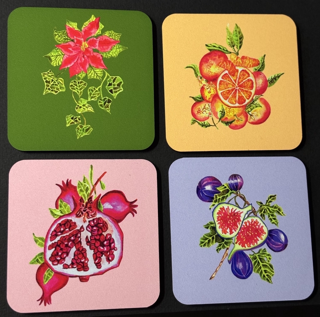 Our festive-themed MDF coasters showcase stunning illustrations of pomegranates, figs, oranges, and poinsettia. Each image is a symbol of the holiday season, making them the perfect addition to your household or as a present for someone special. Available in a set of four, you can choose from individual designs or mix and match for a creative set. These 9 cm x 9 cm coasters are expertly crafted, ensuring a durable and long-lasting addition to your home or office. Protect your surfaces in style, while adding a touch of festive charm to your decor.